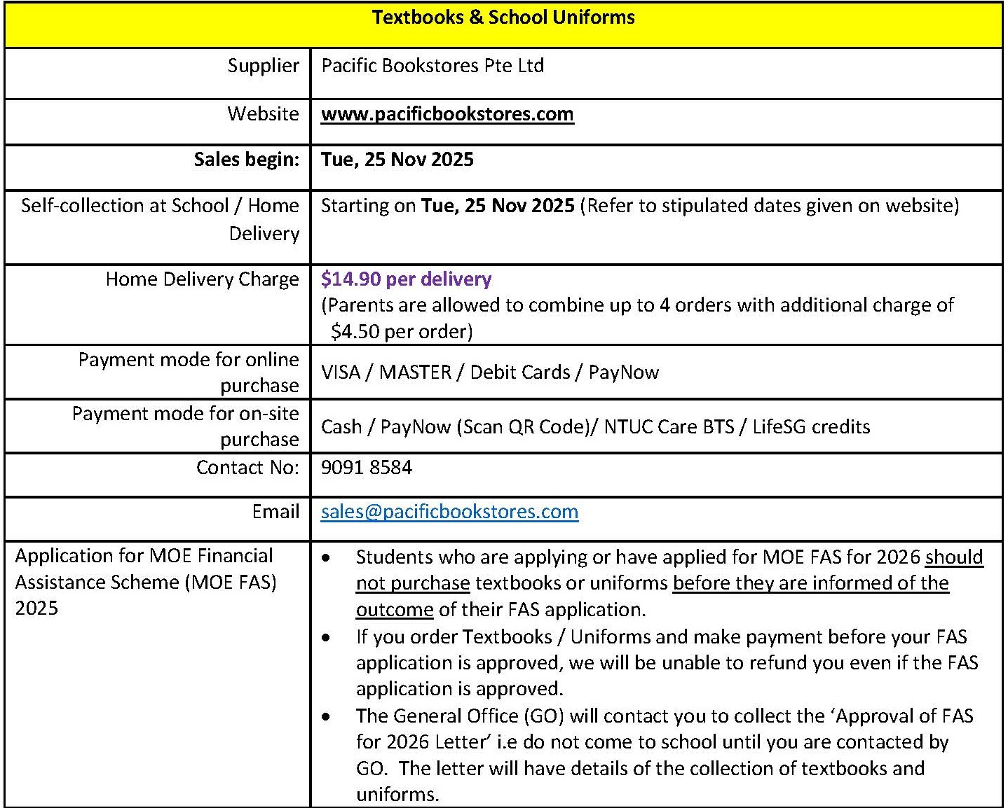 Please note that the sale of 2026 textbooks and uniforms will be conducted online.