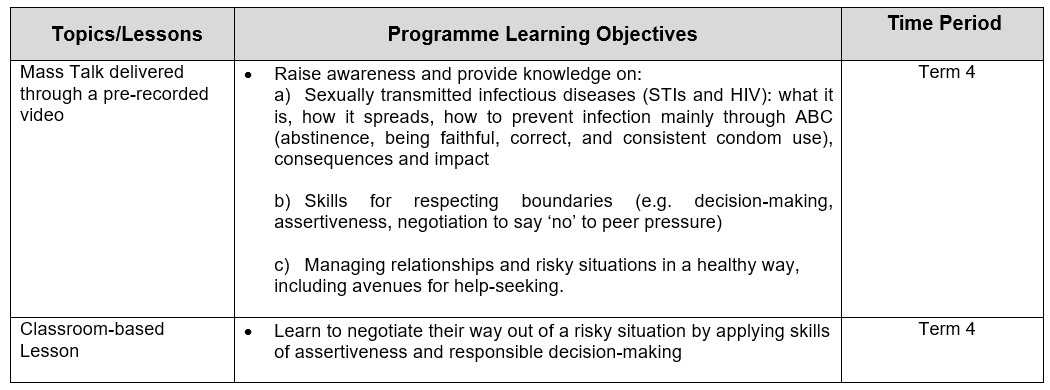 Students are taught skills such as decision-making, assertiveness and negotiation to say “no” to sex and negative peer pressure. They also learn that the impact of STIs/HIV extends beyond themselves and involves their family, and the importance of responsible decision-making and seeking help. Abstinence and upholding family values are the key messages.